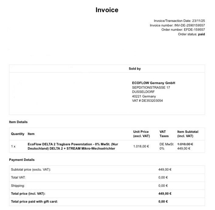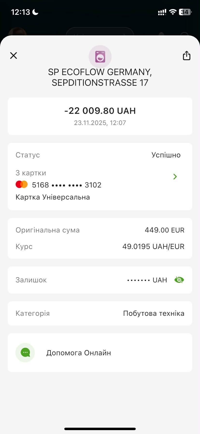 Payé pour : EcoFlow, facture € 449, converti 22010UAH
