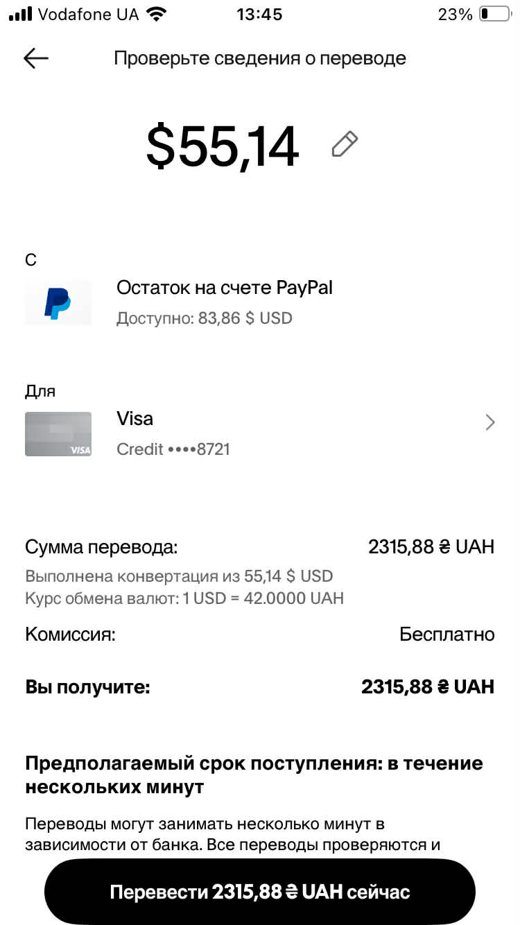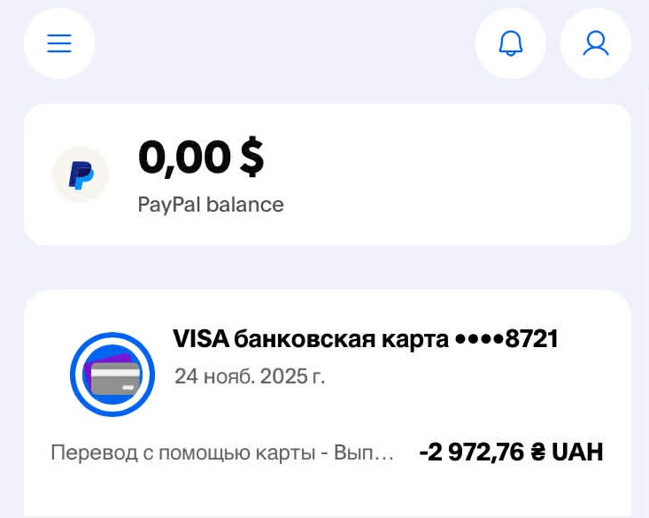 PayPal : 2315,88 + 1206,24 + 2972,76 = 6495UAH (Solde PayPal à zéro)