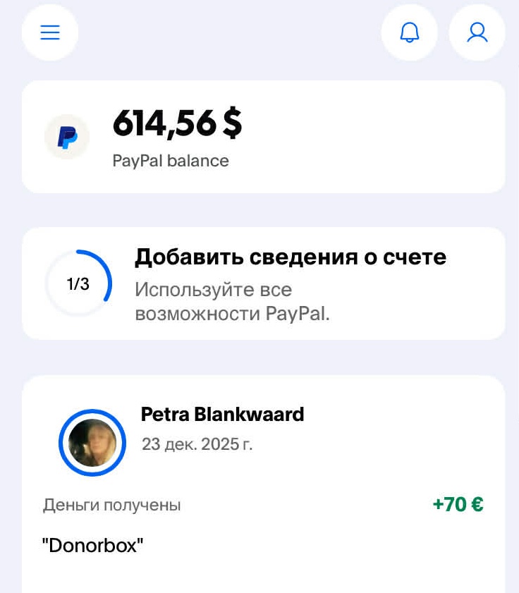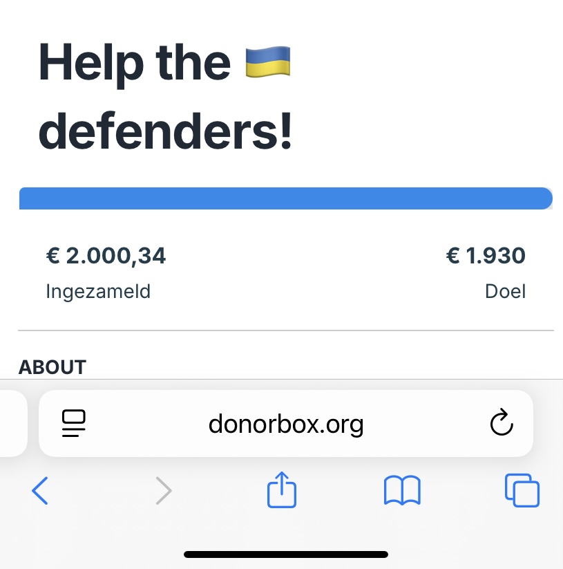 PayPal 25593UAH ($614,56 inclusief €70 Donorbox)