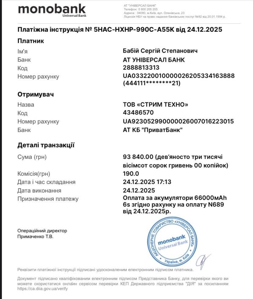 Batterijen voor Vampire 93840UAH – betaald / factuur